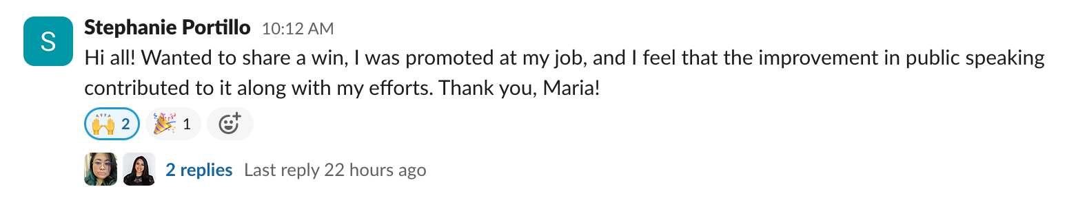 I've gained confidence in my presentations and got promoted just months after working with Maria. Learning public speaking skills made a huge difference and took my career to the next level!Â